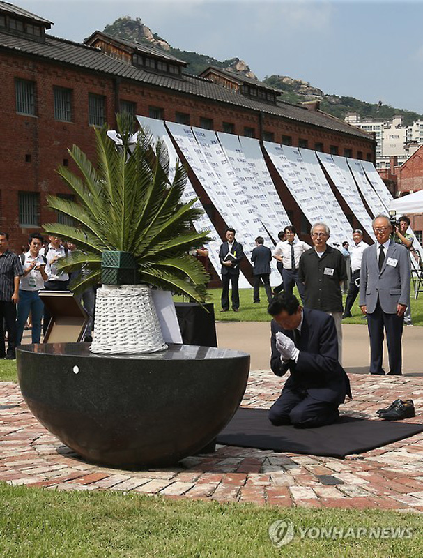 當地時間2015年8月12日,正在韓國訪問的日本前首相鳩山由紀夫參觀了首爾“西大門刑務所”博物館,并在追悼碑前跪地禱告。據悉,西大門刑務所始建于1908年,用于關押反抗日本殖民統治的韓國抗日義士。鳩山由紀夫表示,日本理應承認殖民侵略歷史。(圖片來源:網絡)