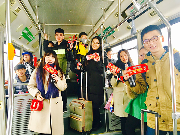 2017年1月13日“春運(yùn)大潮”正式開始,第一波主流人群就是學(xué)生,除了搶車票,擠候車廳,還有前奏就是擠公交,搶出租車去車站。為了讓同學(xué)們更順利的回家,可口可樂(lè)在鄭州5所高校打造了愛(ài)心專列巴士,持續(xù)5天往返于車站和學(xué)校之間,助力按時(shí)抵達(dá)。“還有什么比回家更開心的嗎?還有什么比,邊喝可口可樂(lè)邊看別人擠公交車更開心的嗎?愛(ài)心巴士好贊,讓我們的歸家路無(wú)比快樂(lè)和暖心!” 河南輕工業(yè)大學(xué)大三耿嘉尉同學(xué)高興的說(shuō)著。