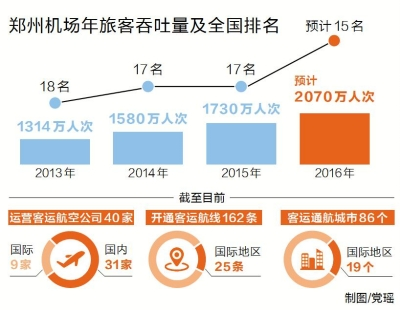 據鄭州機場相關負責人介紹,2014年鄭州機場旅客吞吐量突破1580萬人次,同比增長20%,增速位居全國20個大型機場首位。