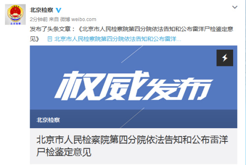 6月30日,北京市人民檢察院第四分院向雷洋死亡案件涉案警務人員及其家屬、雷洋家屬及雙方聘請的律師依法告知了雷洋尸檢鑒定意見。